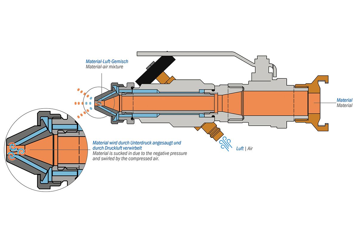 The spray lance serves for seamless application of paste-like to high-viscous materials as mineral, bitumen-containing and bitumen-free thick coatings. Used with screw pump DESOI PowerInject SP20 the spray lance ensures a homogenous material application of a defined layer thickness. Due to its design it is suitable for big and/or hardly accessible surfaces. In action, due to the supply of air, a negative pressure is generated at the end of the spray lance, so that the material is gently sucked in and sprayed.